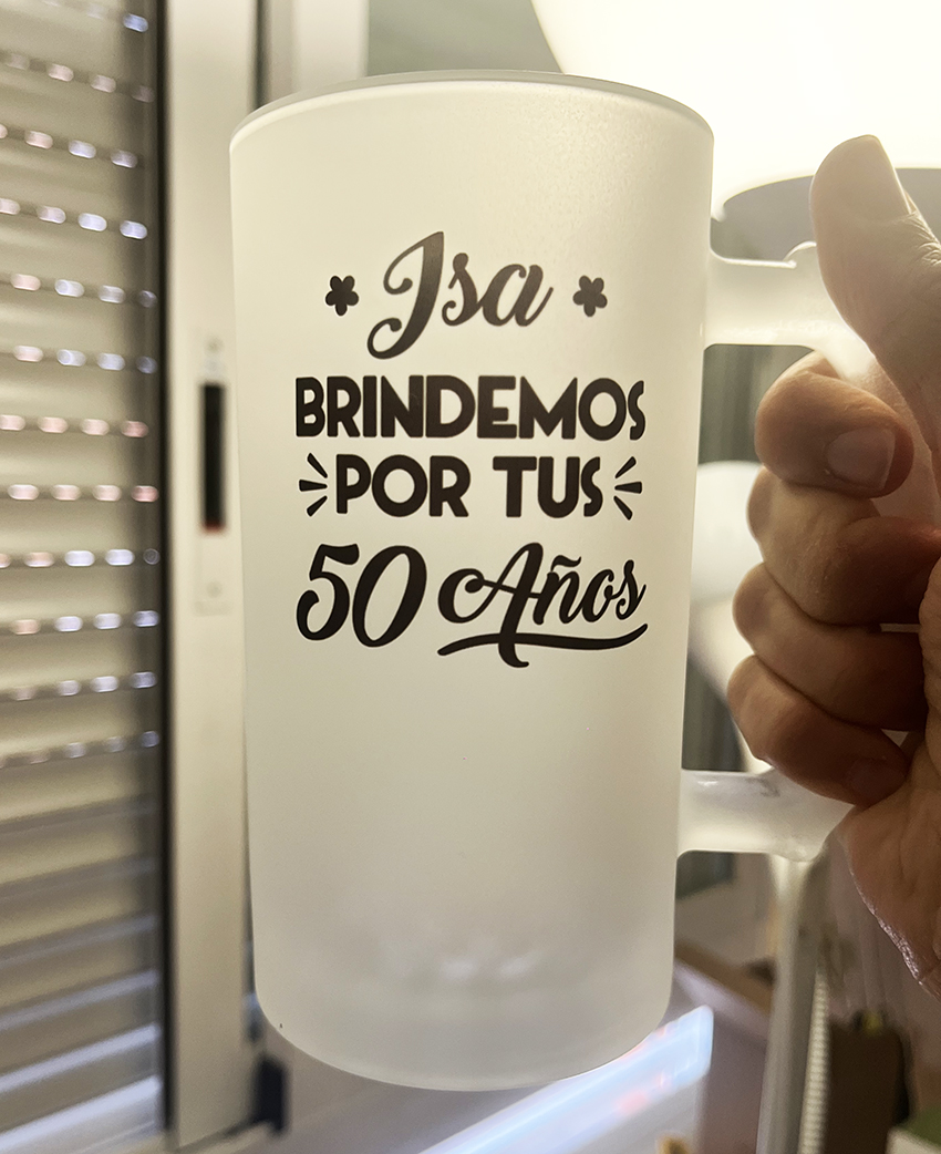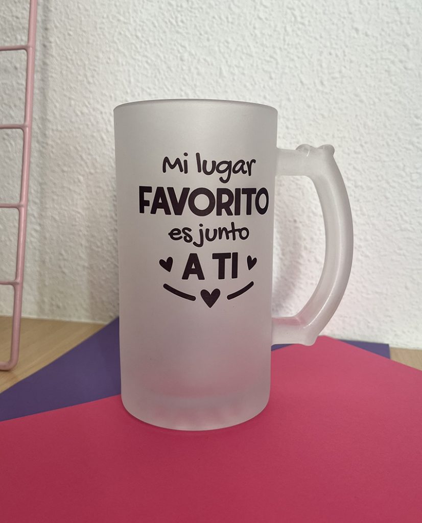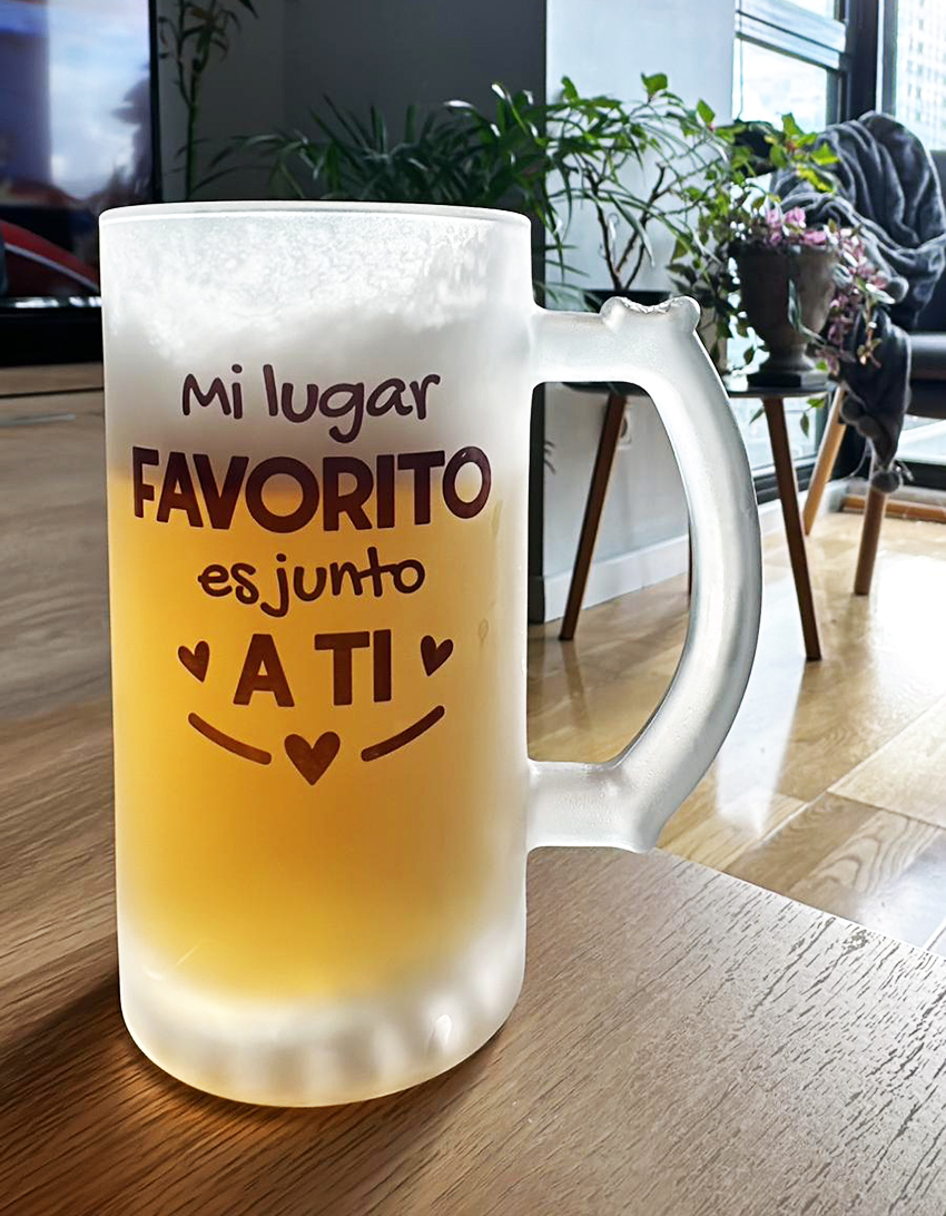 Jarra esmerilada translúcida ideal para beber cerveza u otra bebida fría, tiene capacidad para 17 oz y la puedes personalizar con el diseño que prefieras.